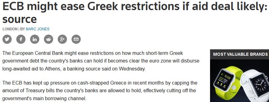 Τηλεγράφημα του Reuters αναφέρει ότι η ΕΚΤ παίζει βασιό ρόλο στους εκβιασμούς με την τακτική «μαστίγιο και καρότο» και όπλο την κάνουλα… της ρευστότητας. Δηλώνει διατεθειμένη να ανοίξει τη στρόφιγγα εάν η Ελλάδα έχει συμφωνία με τους εκπροσώπους των θεσμών.
