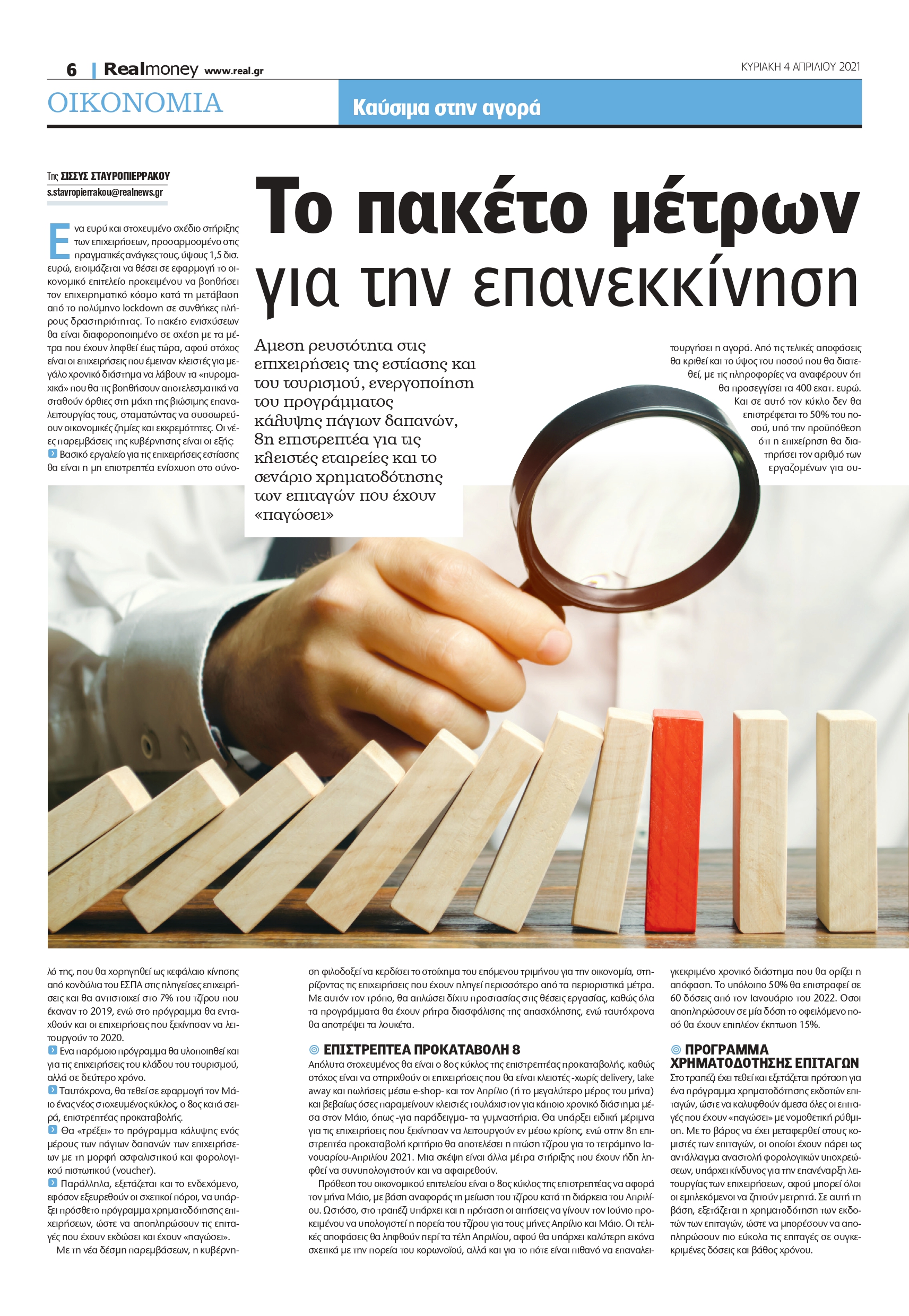 Ένα ευρύ και στοχευμένο σχέδιο στήριξης των επιχειρήσεων, προσαρμοσμένο στις πραγματικές ανάγκες τους, ύψους 1,5 δισ. ευρώ, ετοιμάζεται να θέσει σε εφαρμογή το οικονομικό επιτελείο προκειμένου να βοηθήσει τον επιχειρηματικό κόσμο κατά τη μετάβαση από το πολύμηνο lockdown σε συνθήκες πλήρους δραστηριότητας.