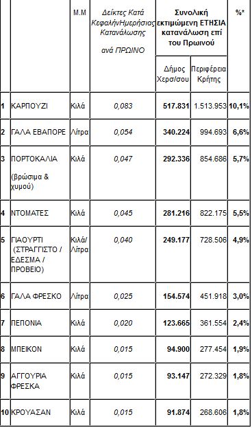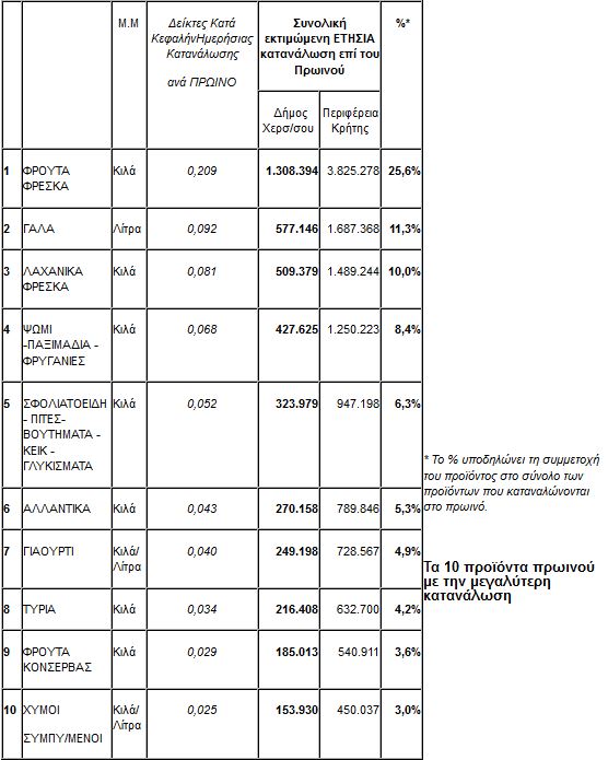 Σύμφωνα με τα ευρήματα, η συνολική ημερήσια κατά κεφαλήν κατανάλωση ανέρχεται στα 816 γρ. Ποσότητα που αντιστοιχεί σε ετήσια κατανάλωση από το σύνολο των τουριστών που ξεπερνά τους 5.000 τόνους σε προϊόντα πρωϊνού όσον αφορά στο Δήμο Χερσόνησου, ενώ εκτιμάται ότι το αντίστοιχο μέγεθος σε επίπεδο Περιφέρειας αγγίζει τους 15.000 τόνους.