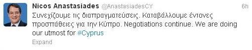 Λίγα λεπτά πριν από τις 01:30 ώρα Ελλάδας ο πρόεδρος της Κύπρου και πάλι μέσω Twitter ενημέρωσε ότι: «κορυφώνονται οι προσπάθειες, σε 15 λεπτά ξεκινά το eurogroup», δίνοντας θετικό στίγμα για τις εξελίξεις.