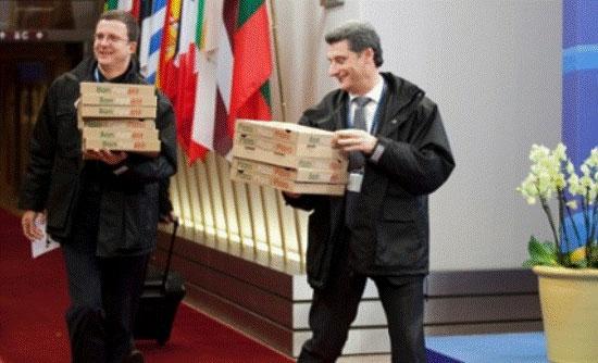 Λίγο μετά τις 10 το βράδυ της Κυριακής υπάλληλοι της Ευρωπαϊκής Ένωσης εμφανίστηκαν να κρατούν κουτιά με πίτσες τα οποία μετέφεραν στην αίθουσα συνεδριάσεων του Eurogroup. Η νύχτα προμηνυόταν μακρά και δύσκολη.