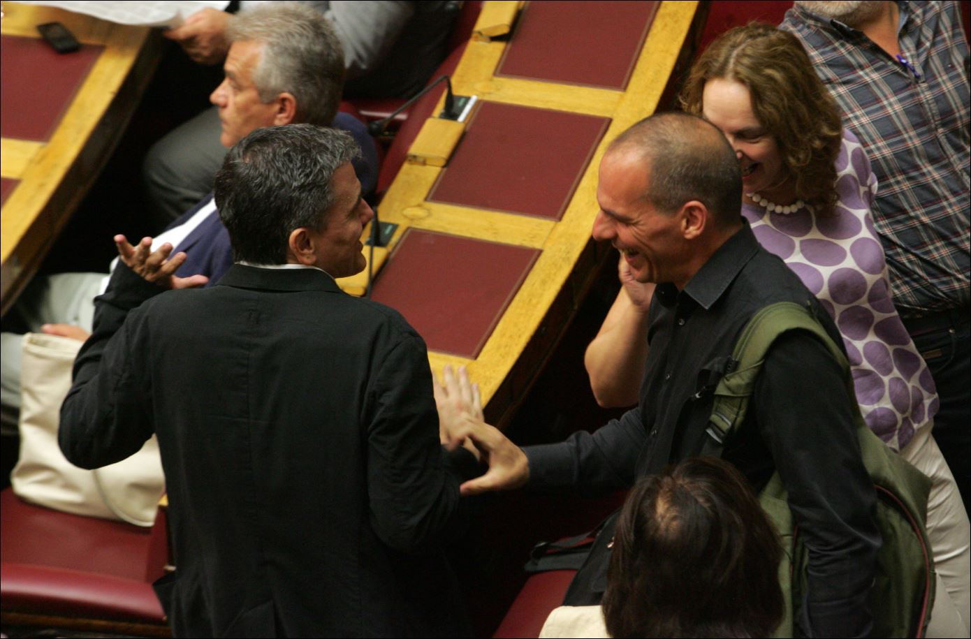 O φωτογραφικός φακός «συνέλαβε» τον υπουργό Οικονομικών Ευκλείδη Τσακαλώτο και τον προκάτοχό του Γιάνη Βαρουφάκη να συνομιλούν χαμογελαστοί πριν από την έναρξη της συζήτησης στην Ολομέλεια της Βουλής του νομοσχεδίου με το δεύτερο πακέτο προαπαιτούμενων μέτρων.