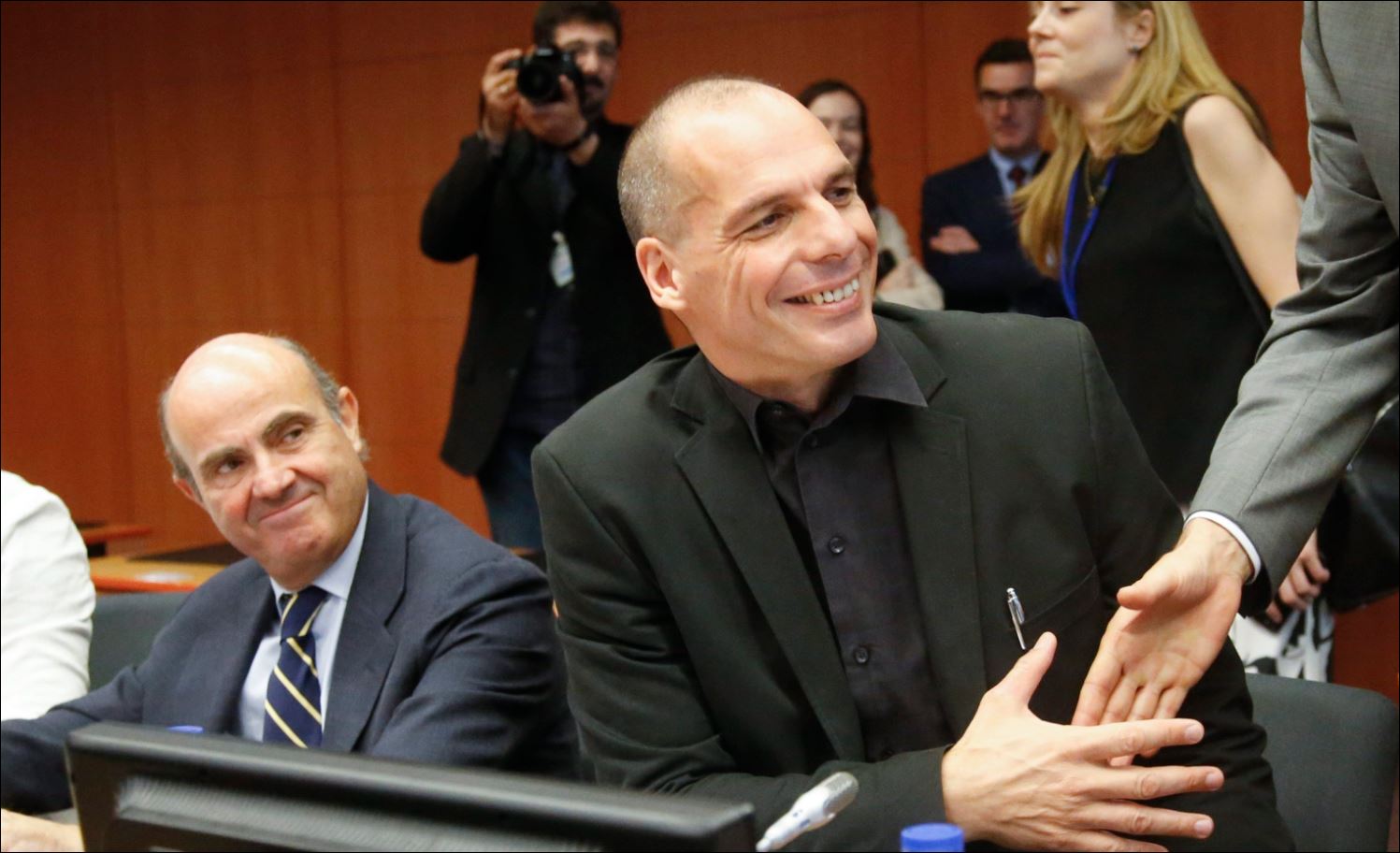 Ο φωτογραφικός φακός “συνέλαβε” τους Γιάνη Βαρουφάκη και Γερούν Ντάισελμπλουμ να χαμογελούν και να ανταλλάσσουν χειραψία πριν από την έναρξη του Eurogroup. Εκτός από τον Έλληνα υπουργό Οικονομικών και τον επικεφαλής του Eurogroup χαμογελαστοί είναι και ο επικεφαλής της ομάδας διαπραγμάτευσης Ευκλείδης Τσακαλώτος και ο Ισπανός υπουργός Οικονομικών Λουίς Ντε Γκίντος που τους παρακολουθούν.