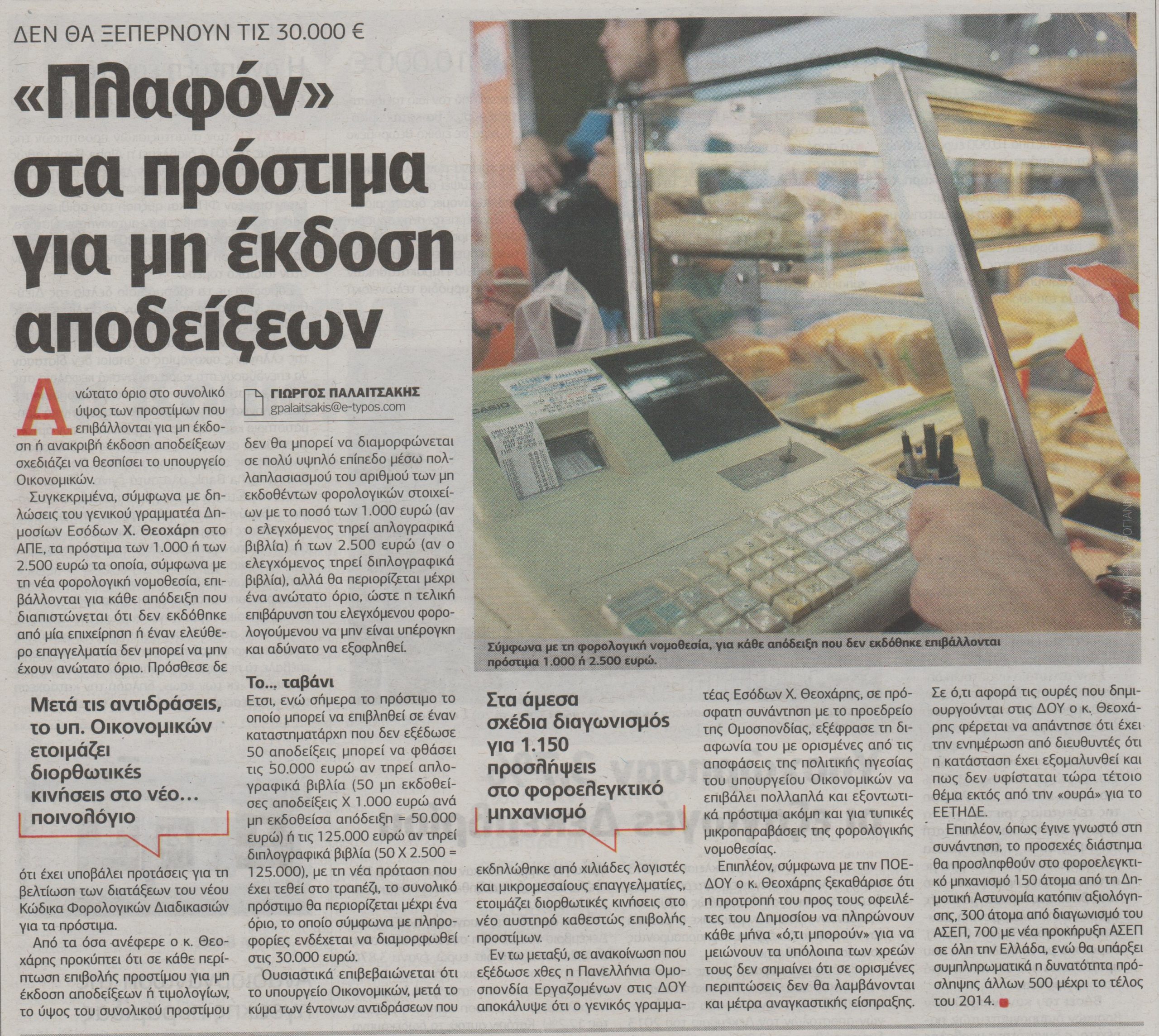 Συγκεκριμένα, σύμφωνα με δηλώσεις του γενικού γραμματέα Δημοσίων Εσόδων, Χάρη Θεοχάρη στο ΑΠΕ, τα πρόστιμα των 1.000 ή των 2.500 ευρώ τα οποία, σύμφωνα με τη νέα φορολογική νομοθεσία, επιβάλλονται για κάθε απόδειξη που διαπιστώνεται ότι δεν εκδόθηκε από μία επιχείρηση ή έναν ελεύθερο επαγγελματία δεν μπορεί να μην έχουν ανώτατο όριο. Πρόσθεσε δε, ότι έχει υποβάλει προτάσεις για τη βελτίωση των διατάξεων του νέου Κώδικα Φορολογικών Διαδικασιών για τα πρόστιμα.