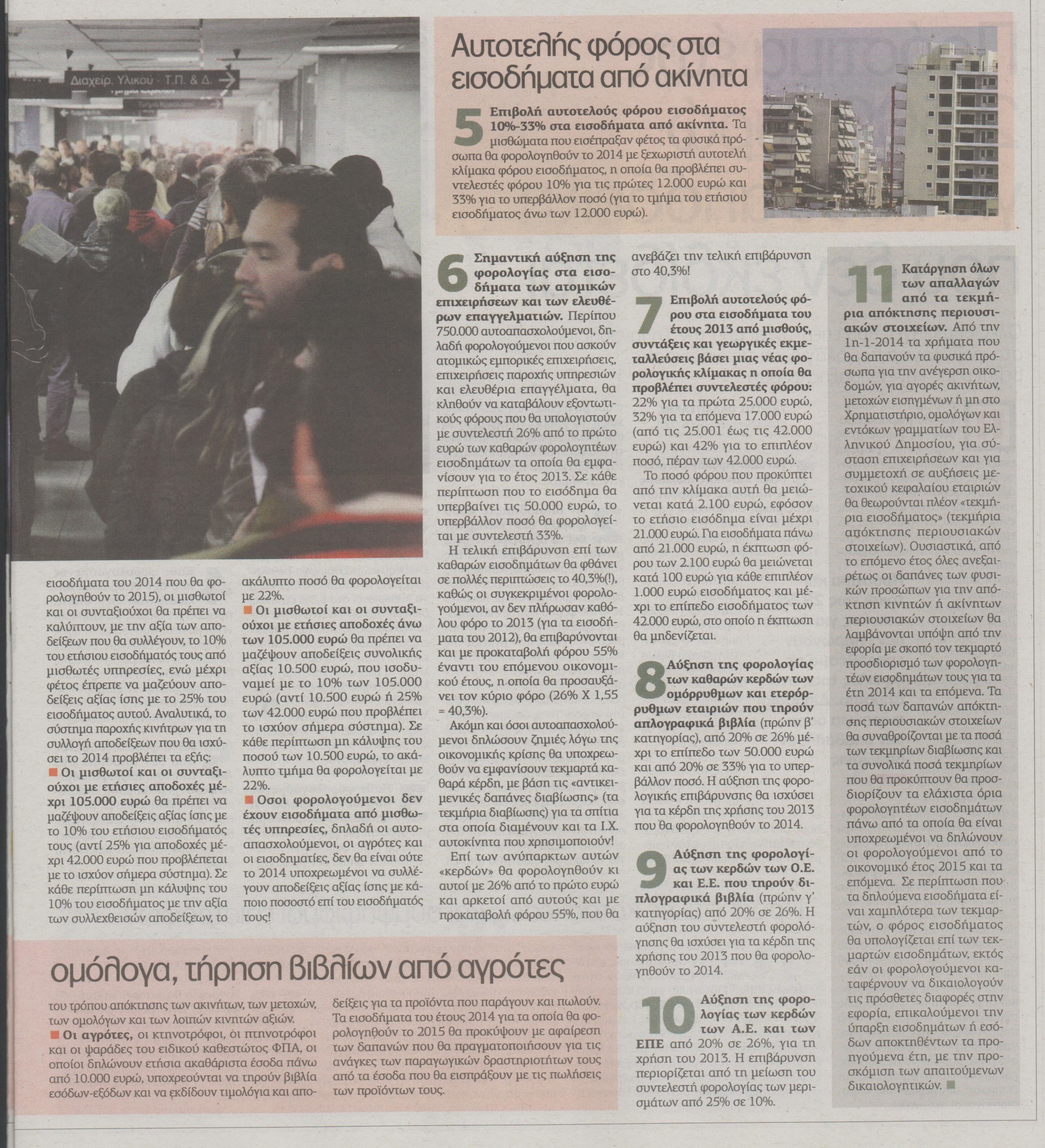 Τα μέτρα αυτά προβλέπουν την κατάργηση όλων των αφορολόγητων ορίων και των εκπτώσεων φόρου εισοδήματος για όλους τους μη μισθωτούς φορολογούμενους, την επιβολή φόρου 26%-40,3% στα καθαρά εισοδήματα των αυτοαπασχολουμένων, τη φορολόγηση των μισθωτών και των συνταξιούχων χώρις πρόσθετα αφορολόγητα για προστατευόμενα τέκνα και χωρίς εκπτώσεις φόρου για ενοίκια, δίδακτρα, ασφάλιστρα ζωής και τόκους δανείων πρώτης κατοικίας, την επιβολή φόρου 10%-33% στα εισοδήματα από ακίνητα και την αύξηση των συντελεστών φορολόγησης των κερδών των εταιρειών από το επίπεδο του 20% στα επίπεδα του 26%-33%.