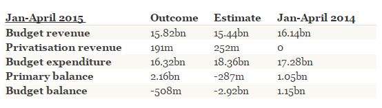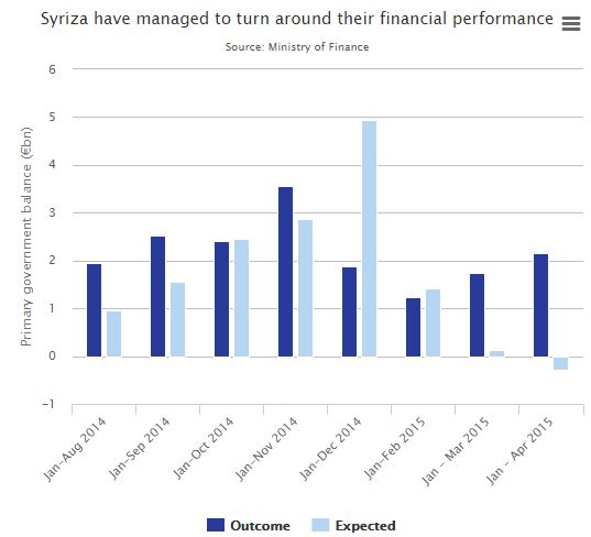 Τα καθαρά έσοδα της χώρας (φόροι) αυξήθηκαν 494 εκατομμύρια ευρώ (15,3% πάνω από τον μηνιαίο στόχο). Το πρωτογενές πλεόνασμα βασισμένο σε περικοπές δαπανών έχει φτάσει στα 2,1 δισ. ευρώ στο 4μηνο, έναντι στόχου για έλλειμμα 287 εκατ. ευρώ.