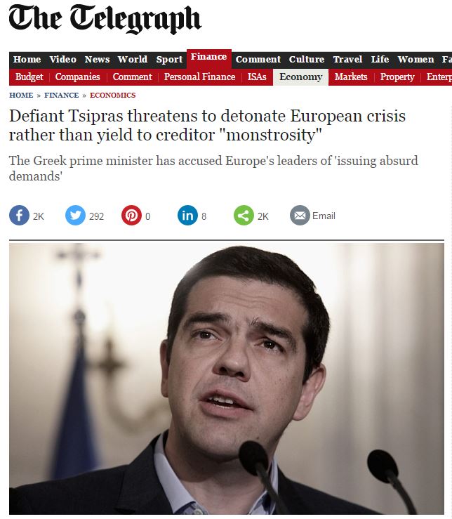 Η Telegraph θεωρεί ρελάνς στους εκβιασμούς των δανειστών τις προειδοποιήσεις Τσίπρα για αποσταθεροποίηση της ευρωζώνης εάν συνεχιστεί η αδιαλλαξία απέναντι στην Ελλάδα.
