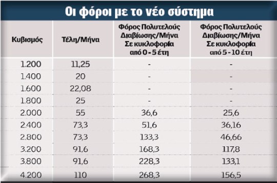 Αν δηλαδή κάποιος κάτοχος ενός οχήματος τετραετίας με κινητήρα 2,4 λίτρα αποφασίσει να το κινήσει για έναν μόνο μήνα θα καταβάλει 73,3 ευρώ για Τέλη και 25,8 ευρώ για Φόρο Πολυτελούς Διαβίωσης. Άλλος ιδιοκτήτης ενός αυτοκινήτου τετραετίας με κινητήρα 3,6 λί��ρων για ετήσια Τέλη Κυκλοφορίας πρέπει να καταβάλλει 1.100 ευρώ, τα οποία στο δωδεκάμηνο επιμερίζονται σε 91,6 ευρώ για κάθε μήνα. Αντίστοιχα, ο Φόρος Πολυτελούς Διαβίωσης κυμαίνεται στις 2.500 ευρώ, το οποίο αναλογικά στο δωδεκάμήνο ισούται με 208,3 ευρώ για κάθε μήνα.