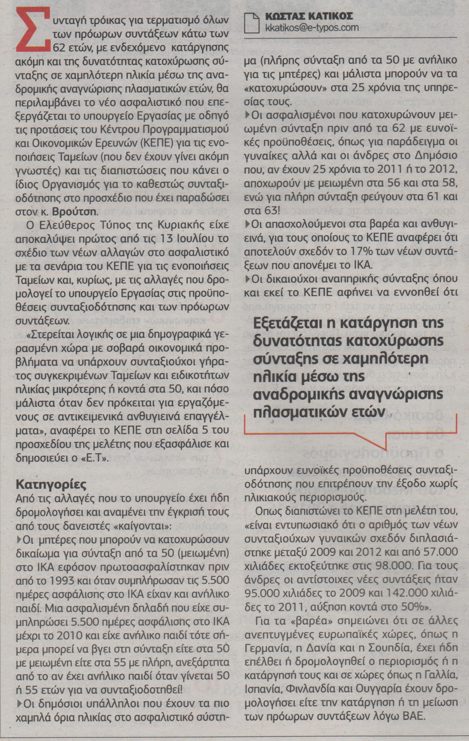 Συνταγή τρόικας για τερματισμό όλων των πρόωρων συντάξεων κάτω των 62 ετών, με ενδεχόμενο κατάργησης ακόμη και της δυνατότητας κατοχύρωσης σύνταξης σε χαμηλότερη ηλικία μέσω της αναδρομικής αναγνώρισης πλασματικών ετών, θα περιλαμβάνει το νέο ασφαλιστικό που επεξεργάζεται το υπουργείο Εργασίας με οδηγό τις προτάσεις του Κέντρου Προγραμματισμού και Οικονομικών Ερευνών (ΚΕΠΕ) για τις ενοποιήσεις Ταμείων (που δεν έχουν γίνει ακόμη γνωστές) και τις διαπιστώσεις που κάνει ο ίδιος Οργανισμός για το καθεστώς συνταξιοδότησης στο προσχέδιο που έχει παραδώσει στο κ. Βρούτση.