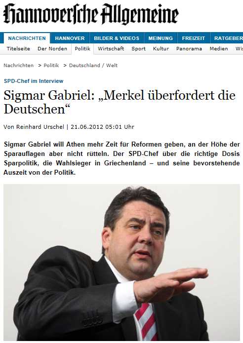«Επί της ουσίας δεν μπορούμε να κάνουμε εκπτώσεις στους Έλληνες, αλλά θα πρέπει να τους δώσουμε περισσότερο χρόνο», επισημαίνει ο πρόεδρος των Γερμανών Σοσιαλδημοκρατών (SPD) Ζίγκμαρ Γκάμπριελ και χαρακτηρίζει “θανατηφόρα” τη δόση του φαρμάκου λιτότητας που χορηγήθηκε στην Ελλάδα από τους Μέρκελ και Σαρκοζί. Παρομοιάζει δε κάποιους Ευρωπαίους ηγέτες με “κλεπταποδόχους”, οι οποίοι θέλουν να επωφεληθούν από την φοροδιαφυγή των Ελλήνων δισεκατομμυριούχων.Σε συνέντευξη που παραχωρεί στην “Hannoversche Allgemeine Zeitung”, κ. Γκάμπριελ συμφωνεί επί της αρχής με το πρόγραμμα λιτότητας για την Ελλάδα, αλλά επισημαίνει ότι ακόμη και το καλύτερο φάρμακο μπορεί να είναι θανατηφόρο, εάν η δόση είναι υπερβολική.
