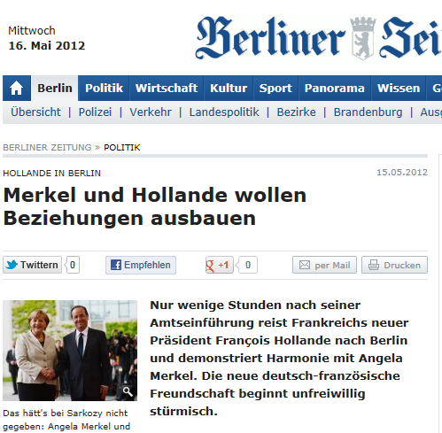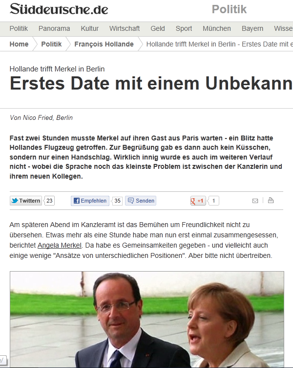 Η κεντροαριστερή εφημερίδα “Berliner Zeitung” συνοψίζει επίσης τις διαφορές των δυο ηγετών με ένα σκίτσο με τίτλο “εμπρός Ευρώπη”: ο γάλλος πρόεδρος Φρανσουά Ολάντ στα αριστερά δηλώνει “γοητευμένος που σας γνωρίζω” και η καγκελάριος Άνγκελα Μέρκελ: “Κι εγώ επίσης”. Φαίνονται κι οι δυο σφιγμένοι, όμως κρατούν καθένας τη σημαία με τ’ αστέρια της Ευρώπης.