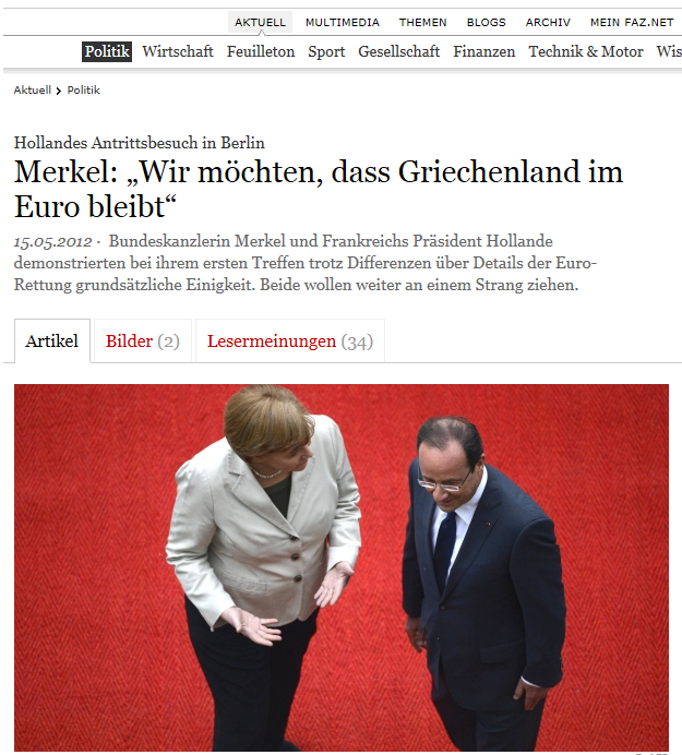 Σύμφωνα με την κεντροαριστερή εφημερίδα “Sueddeutsche Zeitung”, ο γάλλος πρόεδρος Φρανσουά Ολάντ “θα παρατηρήσει σύντομα στο κλαμπ των ισχυρών πως τα μεγάλα προβλήματα της ηπείρου απαιτούν μεγάλους συνασπισμούς”, δηλαδή συμμαχίες πέραν των πολιτικών διαχωριστικών γραμμών.