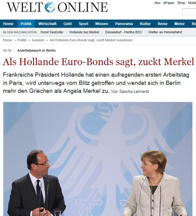 Η εφημερίδα δείχνει τους δύο ηγέτες χαμογελαστούς κάτω από τη βερολινέζικη βροχή μπροστά από τους στρατιώτες της Μπούντεσβερ, αλλά σημειώνει: “όσον αφορά το δημοσιονομικό σύμφωνο, ο Ολάντ παρέμεινε σκληρός: θέλει να επαναδιαπραγματευτεί”.