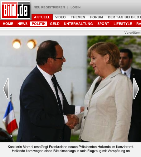 “Βροχή στο Παρίσι, βροχή στο Βερολίνο και, ανάμεσα στα δύο, κεραυνοί πάνω στο αεροπλάνο: τρεις φορές ατυχία την πρώτη ημέρα της ανάληψης των καθηκόντων, αυτό θα μπορούσε να είναι ένα καλό προμήνυμα για τη συνεργασία, είπε η καγκελάριος, υποδεχόμενη τον κ. Ολάντ”, γράφει στην πρώτη σελίδα της η “Μπιλντ”, η εφημερίδα με τη μεγαλύτερη κυκλοφορία στη Γερμανία.