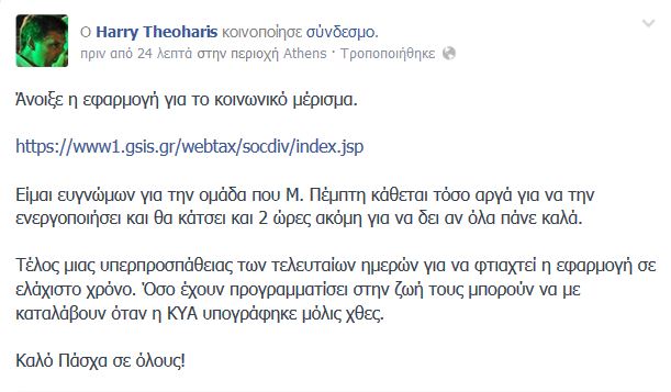 “Είμαι ευγνώμων” τονίζει ο Γενικός Γραμματέας Δημοσίων Εσόδων, Χάρης Θεοχάρης, σε ανάρτηση του στο προφίλ του στο facebook, ευχαριστώντας την ομάδα των ανθρώπων που εργάζονται Μεγάλη Πέμπτη μέχρι τέτοια ώρα για να θέσει σε λειτουργία την εφαρμογή για το κοινωνικό μέρισμα.