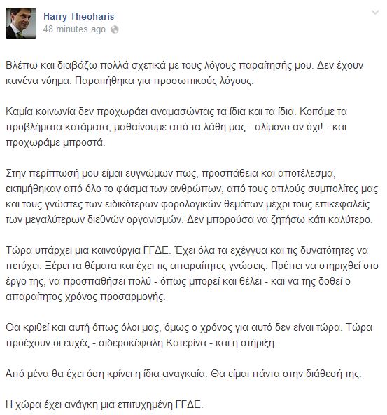 Ο πρώην γενικός γραμματέας Δημοσίων Εσόδων, Χάρης Θεοχάρης, αναφέρθηκε μέσω του προσωπικού του λογαριασμού στο facebook, στους λόγους που τον οδήγησαν σε παραίτηση, ενώ σχολίασε και τη νέα γραμματέα Δημοσίων Εσόδων, Αικατερίνη Σαββαΐδου.