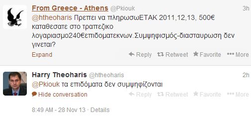 Απαντώντας μέσω twitter σε πολίτη που είχε οφειλές προς την εφορία ύψους 500 ευρώ και ο οποίος έλαβε στον τραπεζικό του λογαριασμό επίδομα τέκνων 240 ευρώ ο Γενικός Γραμματέας Δημοσίων Εσόδων ξεκαθάρισε πως δεν γίνεται συμψηφισμός φορολογικών υποχρεώσεων με επιδόματα. «Τα επιδόματα δεν συμψηφίζονται», ξεκαθάρισε ο κ. Θεοχάρης.