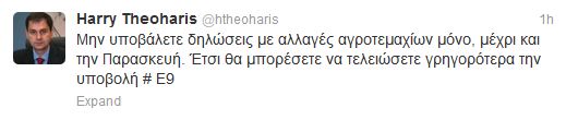 Με το μήνυμά του μέσω του twitter ο κ.Θεοχάρης καλεί τους φορολογούμενους να υποβάλουν τα στοιχεία του Ε-9 για τα αγροτεμάχια μετά τις 20 Σεπτεμβρίου και μέχρι τις 14 Οκτωβρίου, οπότε λήγει η σχετική προθεσμία για τα αγροτεμάχια.
