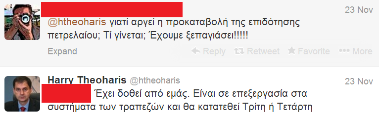 Είδηση μέσω του twitter έδωσε για μία ακόμα φορά ο Γενικός Γραμματέας Δημοσίων Εσόδων, Χάρης Θεοχάρης. Ρωτήθηκε πότε προβλέπεται να κατατεθεί η ήδη “αργοπορημένη” προκαταβολή της επιδότησης πετρελαίου. Τον ρώτησε ένας χρήστης του twitter: “γιατί αργεί η προκαταβολή της επιδότησης πετρελαίου; Τί γίνεται; Έχουμε ξεπαγιάσει!!!!!” Και ο κ.Θεοχάρης απάντησε: “Έχει δοθεί από εμάς. Είναι σε επεξεργασία στα συστήματα των τραπεζών και θα κατατεθεί Τρίτη ή Τετάρτη…”