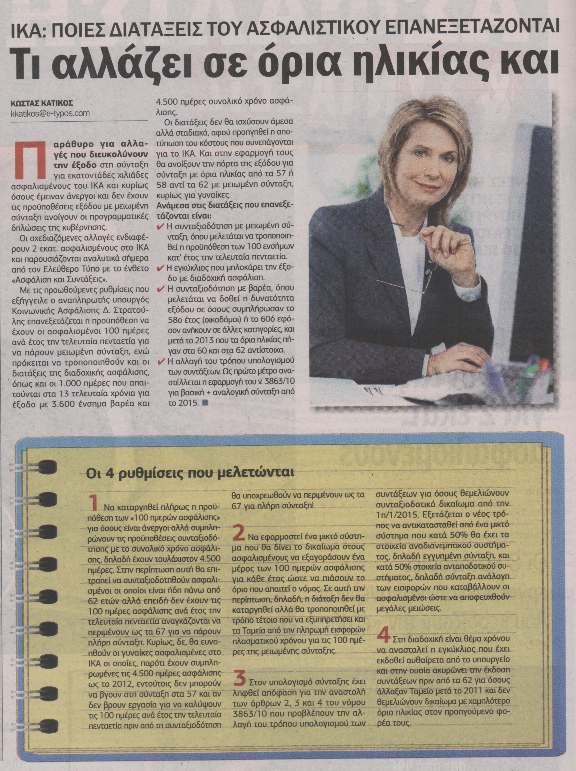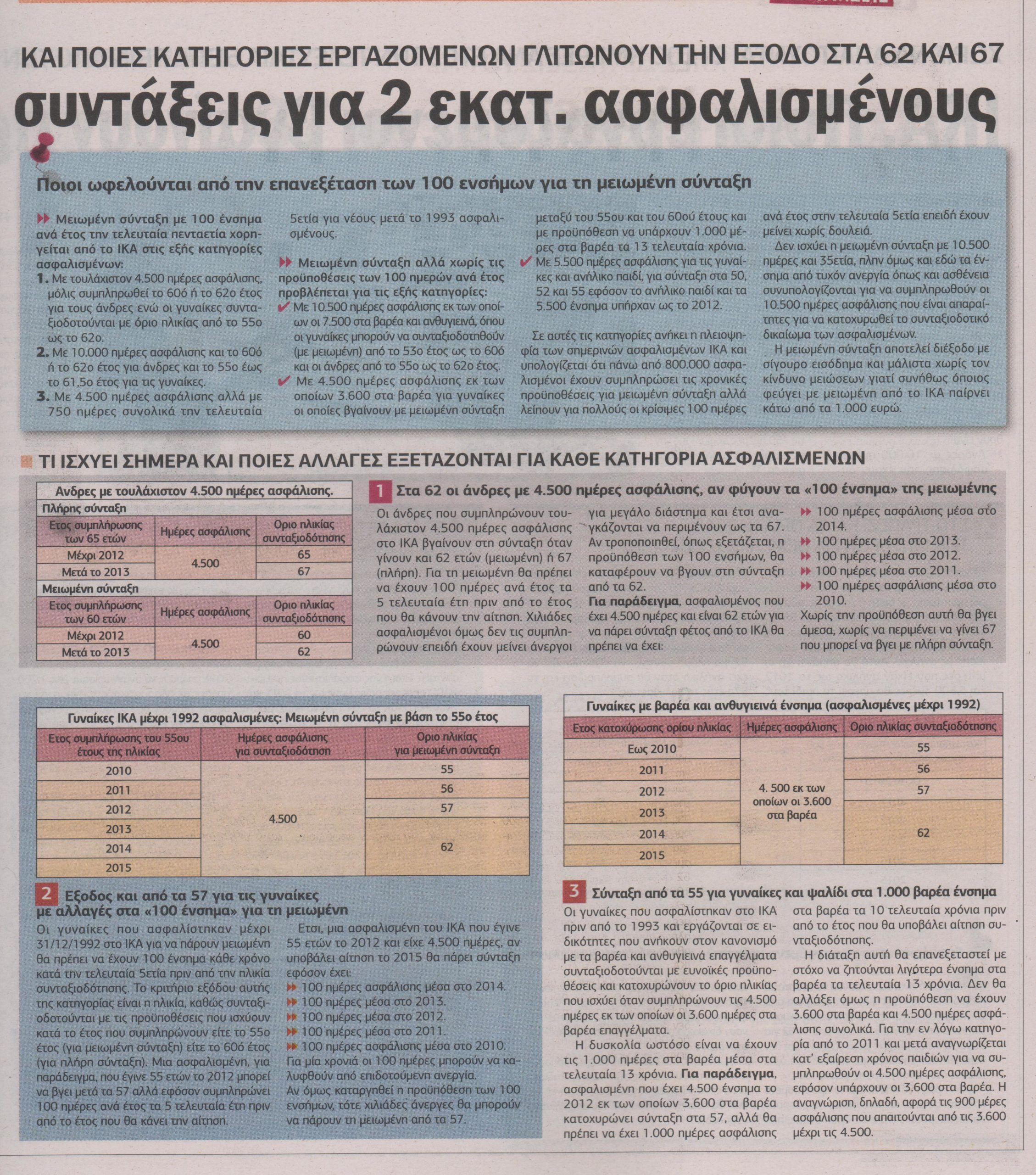 -Η συνταξιοδότηση με μειωμένη σύνταξη, όπου μελετάται να τροποποιηθεί η προϋπόθεση των 100 ενσήμων κατ’ έτος την τελευταία πενταετία.