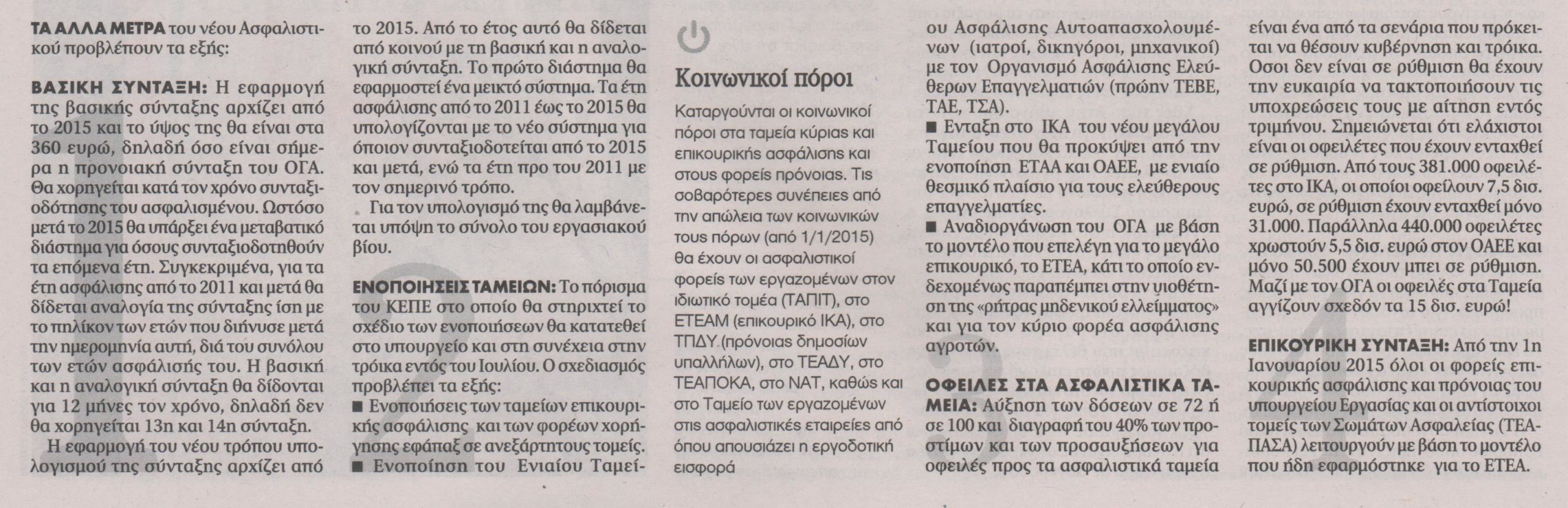 Σε ό,τι αφορά τη βασική σύνταξη: Η εφαρμογή της βασικής σύνταξης αρχίζει από το 2015 και το ύψος της θα είναι στα 360 ευρώ, δηλαδή όσο είναι σήμερα η προνοιακή σύνταξη του ΟΓΑ. Θα χορηγείται κατά τον χρόνο συνταξιοδότησης του ασφαλισμένου. Ωστόσο μετά το 2015 θα υπάρξει ένα μεταβατικό διάστημα για όσους συνταξιοδοτηθούν τα επόμενα έτη. Συγκεκριμένα, για τα έτη ασφάλισης από το 2011 και μετά θα δίδεται αναλογία της σύνταξης ίση με το πηλίκον των ετών που διήνυσε μετά την ημερομηνία αυτή, δια του συνόλου των ετών ασφάλισής του. Η βασική και η αναλογική σύνταξη θα δίδονται για 12 μήνες τον χρόνο, δηλαδή δεν θα χορηγείται 13η και 14η σύνταξη.