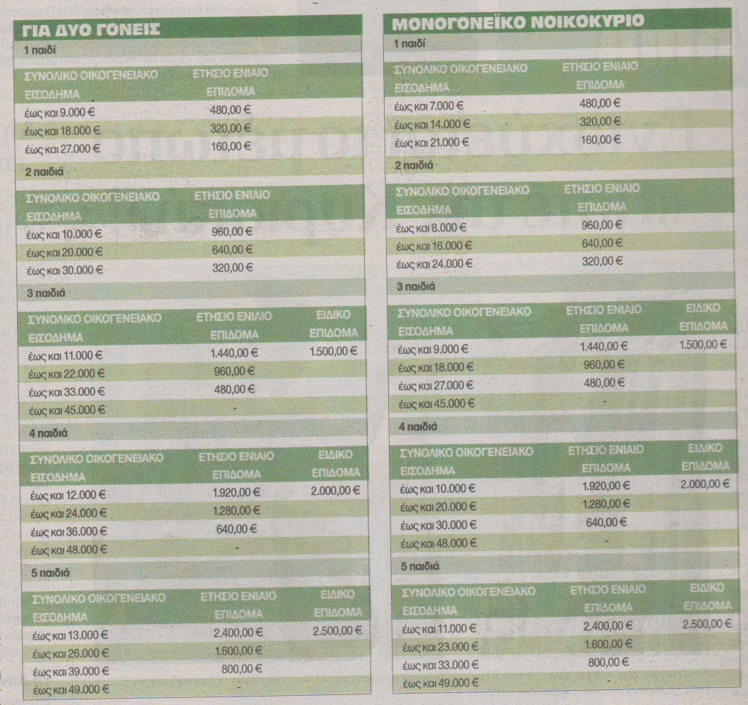 Το τελικό ύψος του ποσού που θα λαμβάνει στο εξής κάθε οικογένεια που δικαιούται το ετήσιο ενιαίο επίδομα στήριξης τέκνων και το ειδικό επίδομα τρίτεκνων και πολυτέκνων καθόρισε το υπουργείο Εργασίας. Με βάση τα εισοδηματικά κριτήρια, το επίδομα χορηγείται στο σύνολό του (480 ευρώ) για οικογένειες με ένα παιδί, αν το ετήσιο οικογενειακό εισόδημα δεν υπερβαίνει τα 9.000 ευρώ για οικογένεια με 2 γονείς και τα 7.000 ευρώ για μονογονεϊκή οικογένεια.