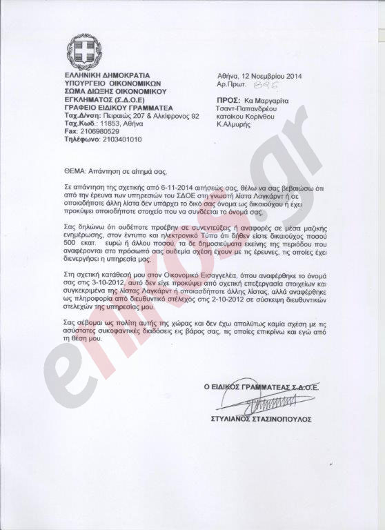 Στο έγγραφο ο κ.Στασινόπουλος υποστηρίζει ότι δεν υπάρχει το όνομα της Μαργαρίτας Παπανδρέου στη λίστα Λαγκάρντ ως δικαιούχου ή με οποιοδήποτε άλλο τρόπο.