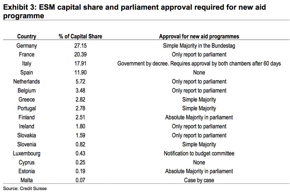 Η Credit Suisse δείχνει σε έναν πίνακα για την Ελλάδα το ποσοστό του μετοχικού κεφαλαίου του Ευρωπαϊκού Μηχανισμού Σταθερότητας (European Stability Mechanism – ESM) που αντιστοιχεί σε κάθε κράτος-μέλος στη μια στήλη.