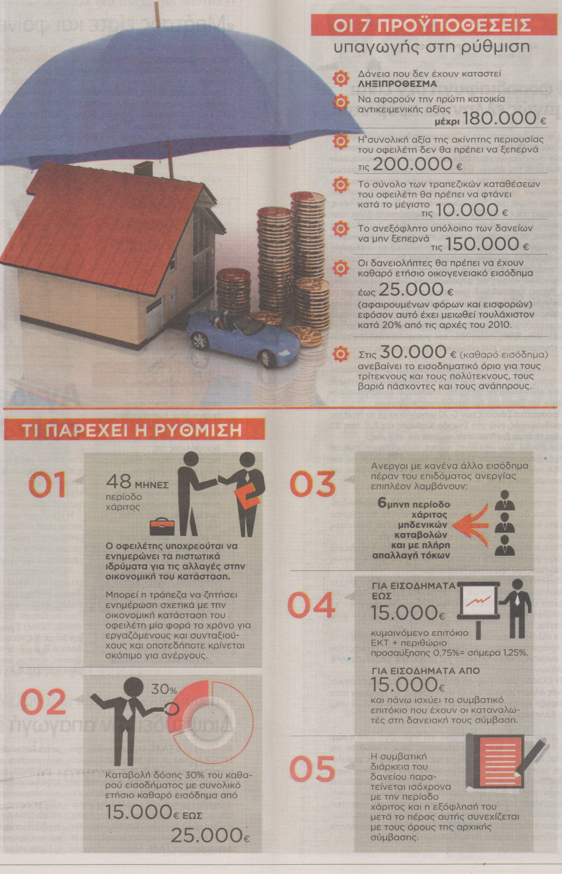 Όπως είναι γνωστό, η ρύθμιση προβλέπει 48μηνη περίοδο χαμηλών καταβολών με μηνιαία δόση μέχρι το 30% του εισοδήματος και αφορά ενήμερα δάνεια, για τα οποία η εμπράγματη εξασφάλιση (εγγραφή προσημείωσης-υποθήκη) της τράπεζας πρέπει να είναι επί της κύριας κατοικίας.