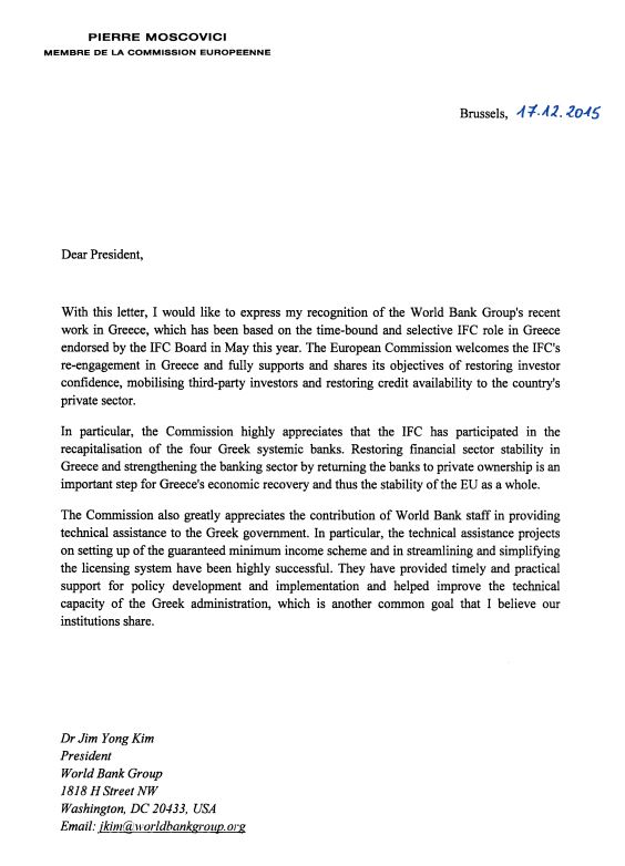 “Με αυτή την επιστολή, θα ήθελα να εκφράσω την αναγνώρισή μου στην πρόσφατη δραστηριοποίηση του ομίλου της Παγκόσμιας Τράπεζας στην Ελλάδα, η οποία βασίζεται στον επιλεκτικό και χρονικά καθορισμένο ρόλο του IFC (International Finance Corporation) στην Ελλάδα, όπως αποφασίσθηκε από το συμβούλιο του IFC τον Μάιο αυτής της χρονιάς.