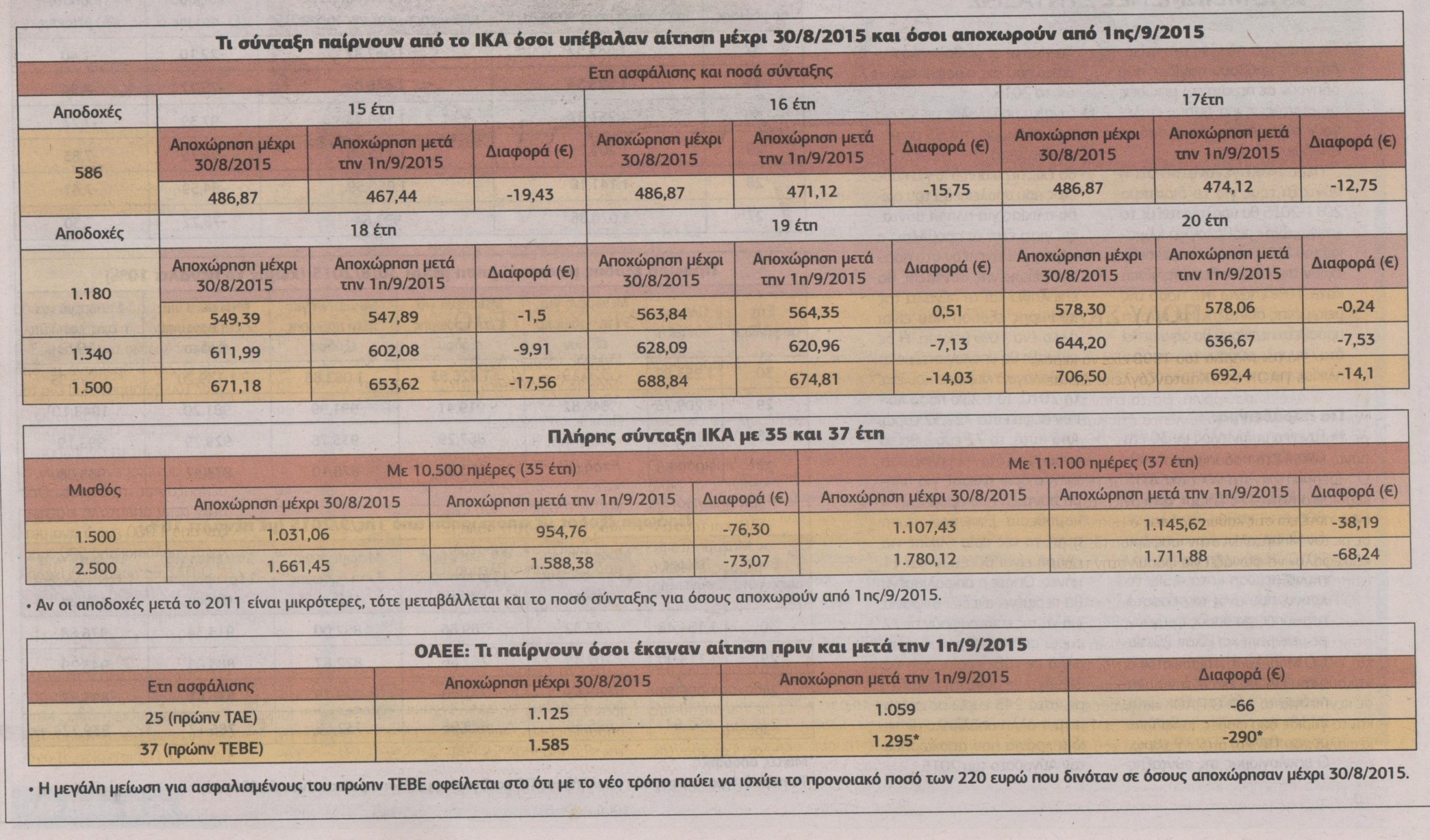 Ενώ όσοι αποχώρησαν μέχρι 30/8/2015 παίρνουν σύνταξη με το παλιό καθεστώς, δηλαδή δεν επηρεάζονται από τις αλλαγές. Όλοι όμως θα έχουν νέες μειώσεις από τη στιγμή που θα ψηφιστεί ο νόμος για το νέο ασφαλιστικό τον Νοέμβριο, ο οποίος θα εφαρμοστεί από 1ης/1/2016. Μέχρι τότε τα Ταμεία θα πρέπει να βγάζουν συντάξεις με δύο διαφορετικούς τρόπους (για τους αποχωρήσαντες μέχρι 30/8/2015 και μετά την 1η/9/2015), ενώ με το νέο νόμο θα αναγκαστούν να αλλάξουν εκ νέου τον τρόπο υπολογισμού πιθανότατα από το 2016.