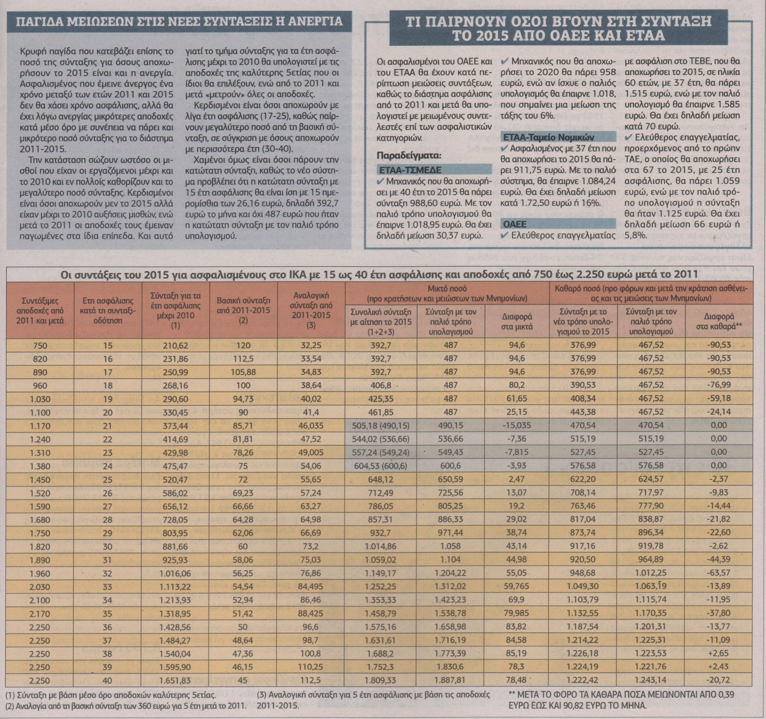 Κλειδί για τις συντάξεις του 2015 είναι οι αποδοχές των εργαζομένων αλλά και το διάστημα της ασφάλισής τους από το 2011 και μετά. Αν οι αποδοχές τους έχουν μειωθεί σημαντικά στην περίοδο 2011-2015, τότε η μείωση αυτή θα «μεταφερθεί» και στο αναλογικό κομμάτι της σύνταξής τους, αυτό δηλαδή που αντιστοιχεί στο χρόνο ασφάλισης και τον μέσο όρο των αποδοχών τους από το 2011 και μετά. Αν δεν έχουν μείωση μισθού, τότε το αναλογικό ποσό σύνταξης θα είναι βελτιωμένο.