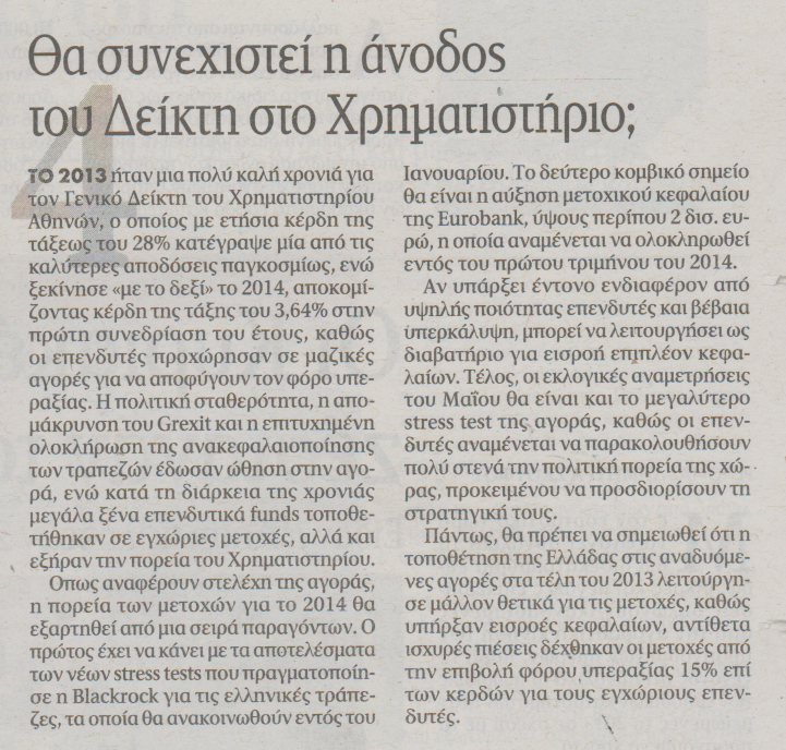 Την ίδια στιγμή, στο «μέτωπο» των επενδύσεων, έπειτα από ετήσια κέρδη που ξεπέρασαν το 25% για το 2013, το μέλλον του ελληνικού χρηματιστηρίου αποτελεί δυσεπίλυτο γρίφο για τους επενδυτές.