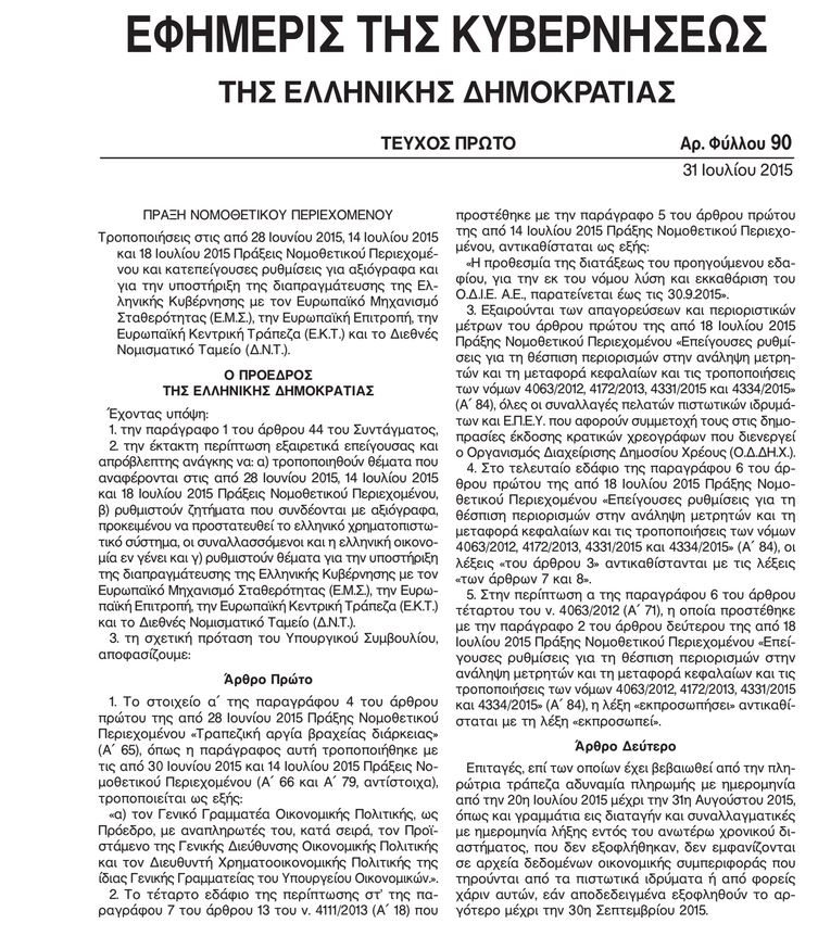 «Επιταγές, επί των οποίων έχει βεβαιωθεί από την πληρώτρια τράπεζα αδυναμία πληρωμής με ημερομηνία από την 20η Ιουλίου 2015 μέχρι την 31η Αυγούστου 2015, όπως και γραμμάτια εις διαταγήν και συναλλαγματικές με ημερομηνία λήξης εντός του ανωτέρω χρονικού διαστήματος, που δεν εξοφλήθηκαν, δεν εμφανίζονται σε αρχεία δεδομένων οικονομικής συμπεριφοράς που τηρούνται από τα πιστωτικά ιδρύματα ή από φορείς χάριν αυτών, εάν αποδεδειγμένα εξοφληθούν το αργότερο μέχρι την 30η Σεπτεμβρίου 2015».