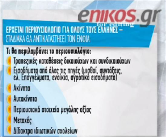 Σύμφωνα με το ρεπορτάζ της εκπομπής, το περιουσιολόγιο θα περιλαμβάνει τραπεζικές καταθέσεις δικαιούχων και συνδικαιούχων, μισθούς, συντάξεις, ενοίκια, αγροτικά εισοδήματα, ακίνητα, αυτοκίνητα, περιουσιακά στοιχεία μεγάλης αξίας, μετοχές και δίδακτρα ιδιωτικών σχολείων.