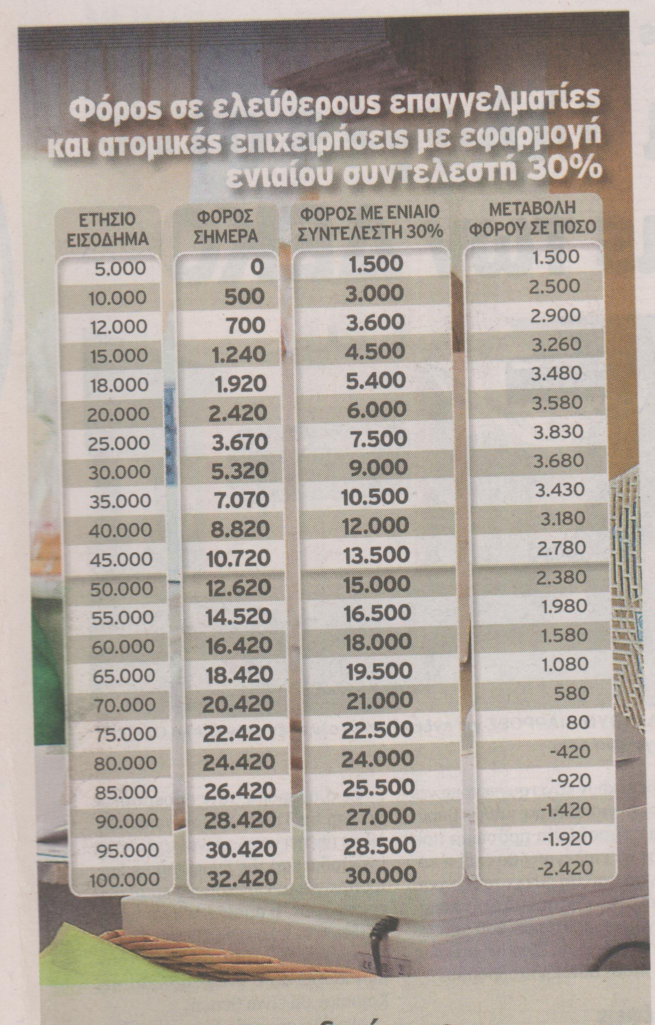 Μείωση στο 30% του ανώτατου συντελεστή για μισθωτούς και συνταξιούχους, ενιαίο φόρο 30% στους επαγγελματίες και 30% συνολική φορολόγηση των επιχειρήσεων, προβλέπει το κυβερνητικό σχέδιο, σύμφωνα με το «Έθνος». Με τις επικείμενες αλλαγές στα κλιμάκια και τους συντελεστές, το υπουργείο Οικονομικών, , προβλέπει ελαφρύνσεις σε μισθωτούς και συνταξιούχους, αλλά βάζει στο στόχαστρο τους ελεύθερους επαγγελματίες. Δείτε στον πίνακα που ακολουθεί τον φόρο που αναλογεί, για ελεύθερους επαγγελματίες και ατομικές επιχειρήσεις, με την εφαρμογή που ενιαίου συντελεστή του 30%.