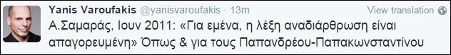 “Αντώνης Σαμαράς, Ιούνιος 2011: «Για εμένα, η λέξη αναδιάρθρωση είναι απαγορευμένη» Όπως και για τους Παπανδρέου-Παπακωνσταντίνου” έγραψε χαρακτηριστικά ο υπουργός Οικονομικών.