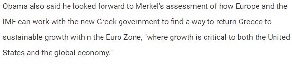 Σύμφωνα με το United Press International, στη συνάντηση που είχε ο Ομπάμα με τη Γερμανίδα Καγκελάριο στο Βερολίνο, ο Αμερικανός Πρόεδρος τόνισε ότι: «η επιστροφή της Ελλάδας στη βιώσιμη ανάπτυξη εντός της ζώνης του ευρώ είναι ζωτικής σημασίας, τόσο για τις ΗΠΑ, όσο και για την παγκόσμια οικονομία».