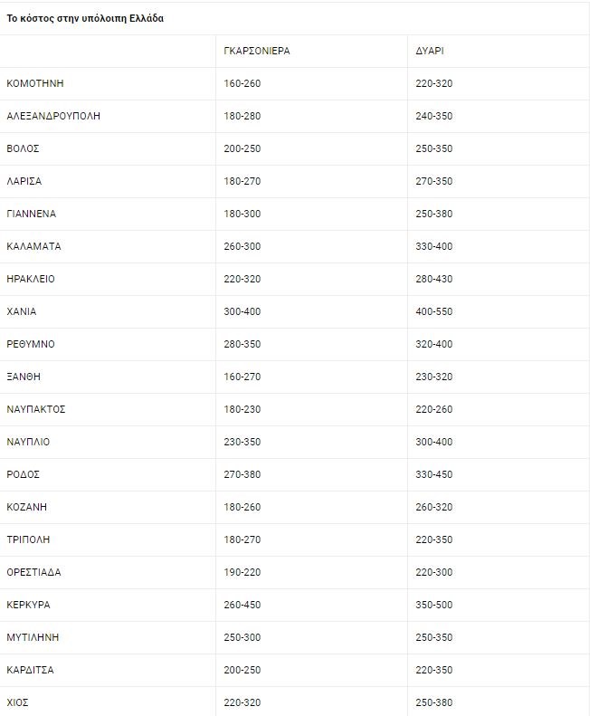 Όπως αναφέρεται στο δημοσίευμα σύμφωνα με τα στοιχεία του E-Real Estates, από 280 ευρώ έως και 350 ευρώ είναι σήμερα το μηνιαίο κόστος μιας γκαρσονιέρας (πλήρως ανακαινισμένης) στη Βικτώρια, όταν πέρυσι τα ενοίκια κυμαινόταν μεταξύ 170 ευρώ και 260 ευρώ. Σε λογικά πλαίσια, λαμβάνοντας υπόψη τη γενικότερη εικόνα της κτηματαγοράς στην περιοχή, κινούνται οι τιμές στο Κουκάκι. Τα ζητούμενα ενοίκια για μία γκαρσονιέρα ξεκινούν από 320 ευρώ, για να φτάσουν έως και 450 ευρώ, ενώ το κόστος για τα δυάρια υπολογίζεται σε έως και 600 ευρώ. Στην περιοχή Νεάπολη – Μουσείο οι τιμές καταγράφουν αυξητικές τάσεις, με το κόστος για τις γκαρσονιέρες να διαμορφώνεται σε έως 450 ευρώ και για τα δυάρια σε έως 520 ευρώ/μήνα. Δαπανηρή εξακολουθεί να είναι η ενοικίαση φοιτητικής κατοικίας στο Κολωνάκι. Οι τιμές για γκαρσονιέρες κυμαίνονται από 350 ευρώ έως 650 ευρώ, ενώ για δυάρια από 550 ευρώ έως 750 ευρώ/μήνα. Τέλος, τα μισθώματα στην Καλλιθέα, που συγκεντρώνει το ενδιαφέρον φοιτητών της Παντείου, αλλά και σπουδαστών στις ιδιωτικές σχολές μαγειρικής στο Μοσχάτο, παρουσιάζουν μια σταθερότητα σε σχέση με πέρυσι, με τη λύση της συγκατοίκησης να επιλέγεται κατά κόρον από τους γονείς.