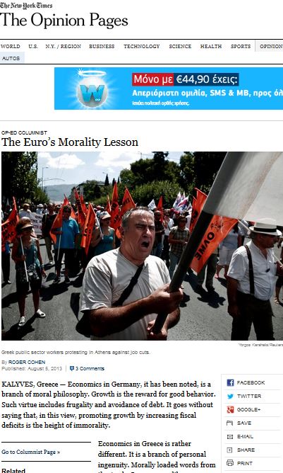 Στο κείμενο, που φέρει τον τίτλο «Το μάθημα ηθικής του Ευρώ», ο συντάκτης συγκρίνει την οικονομική κατάσταση της Ελλάδας και της Γερμανίας με βασικό σημείο τη φιλοσοφία του «βολέματος» που επικρατούσε στο ελληνικό δημόσιο. Μάλιστα, ο δημοσιογράφος προτείνει στους Έλληνες «να μάθουν κάτι από την οικονομία σαν ηθική φιλοσοφία».