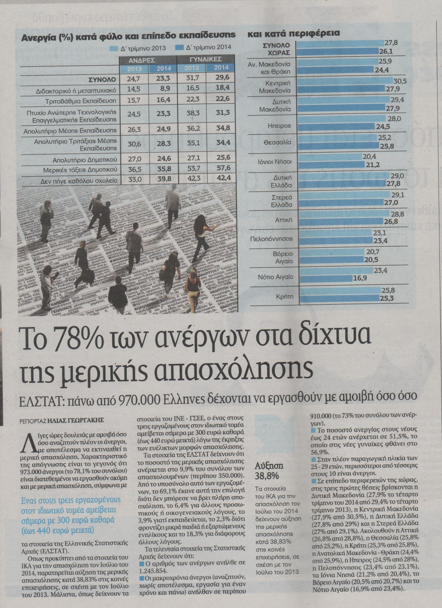 Όπως προκύπτει από τα στοιχεία του ΙΚΑ για την απασχόληση τον Ιούλιο του 2014, παρατηρείται αύξηση της μερικής απασχόλησης κατά 38,83% στις κοινές επιχειρήσεις, σε σχέση με τον Ιούλιο του 2013.