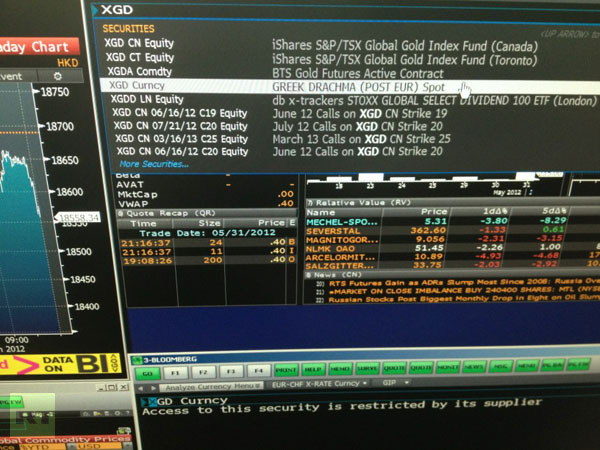Σε πίνακα με ισοτιμίες νομισμάτων που εμφανίστηκε στο Bloomberg για πρώτη φορά από το 2002 από τότε δηλαδή που το ευρώ έγινε το νέο νόμισμα της Ελλάδας, εμφανίστηκε η Δραχμή (Greek Drachma) ως εναλλάξιμη αξία, προκειμένου να είναι έτοιμοι οι επενδυτές για μια πιθανή έξοδο της Ελλάδας από το ευρώ