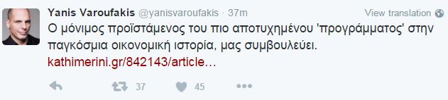 “Ο μόνιμος προϊστάμενος του πιο αποτυχημένου ‘προγράμματος’ στην παγκόσμια οικονομική ιστορία, μας συμβουλεύει” έγραψε αναφερόμενος στη συνέντευξή του επικεφαλής του Euroworking Group στην Καθημερινή, όπου μεταξύ άλλων είπε ότι δεν κλείνει η αξιολόγηση χωρίς το ΔΝΤ.