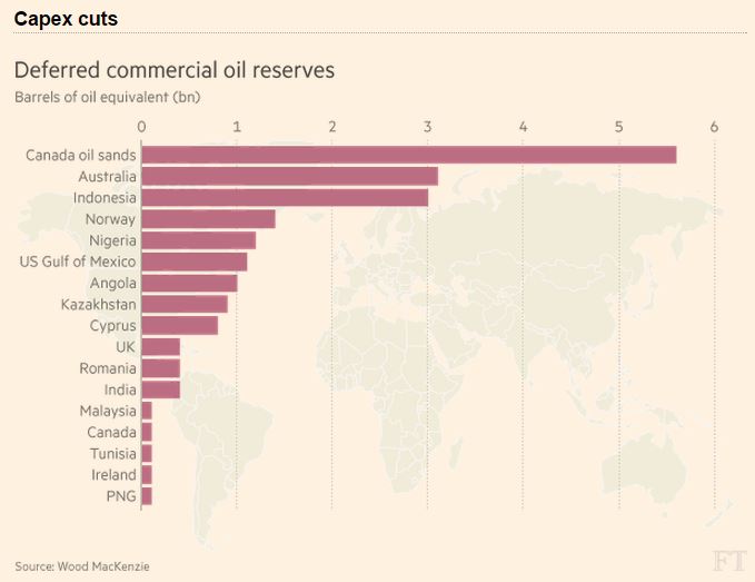 Οι φορείς της βιομηχανίας αναμένουν τις κεφαλαιουχικές δαπάνες σε νέα πρότζεκτς να μειωθούν κατά 20 και 30% κατά μέσο όρο, αναφέρει η Wood Mackenzie, σύμβουλος στον τομέα της ενέργειας. Υπολογίζει πως 220 δισ. δολάρια επενδύσεων έχουν περικοπεί μέχρι στιγμής, περίπου 20 δισ. δολάρια περισσότερα απ΄ ό,τι είχε εκτιμήσει πριν δύο μήνες και τα περισσότερα απ’ αυτά αναβλήθηκαν. Μια τέτοια μείωση στις δαπάνες σημαίνει πως η κατάρρευση της τιμής από πέρυσι το καλοκαίρι -αποτέλεσμα της πιο αδύναμης κινέζικης ζήτησης, της αμερικανικής παραγωγής σε επίπεδα ρεκόρ και της απόφασης της Σαουδικής Αραβίας να μη μειώσει την παραγωγή- θα μπορούσε να μοιάζει με την άγρια ύφεση στα μέσα της δεκαετίας του 1980.