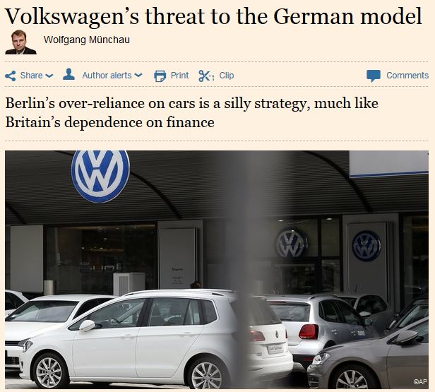 Ακόμα σημαντικότερο, το σκάνδαλο της Volkswagen έχει τη δυναμική να ανατρέψει το γερμανικό οικονομικό μοντέλο. Στηρίχθηκε υπερβολικά στην αυτοκινητοβιομηχανία, όπως η αυτοκινητοβιομηχανία στηρίχθηκε υπερβολικά στην τεχνολογία ντίζελ.