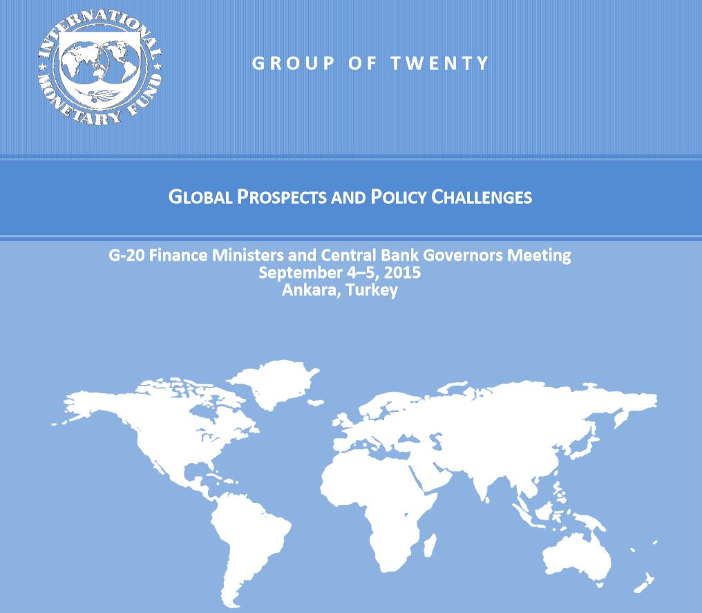 Τον Ιούλιο το G20 είχε αναθεωρήσει επί τα χείρω την πρόβλεψή του για την παγκόσμια ανάπτυξη στο 3,3% και είχε εκτιμήσει πως η ανάπτυξη στην Κίνα θα επιβραδυνθεί στο 6,8%. Στο σημείωμά του δεν επικαιροποίησε αυτές τις εκτιμήσεις. Στην Κίνα το ΔΝΤ καλεί στο σημείωμα να συνεχιστούν οι μεταρρυθμίσεις για το περαιτέρω άνοιγμα της οικονομίας, παρά την αναταραχή στις αγορές.