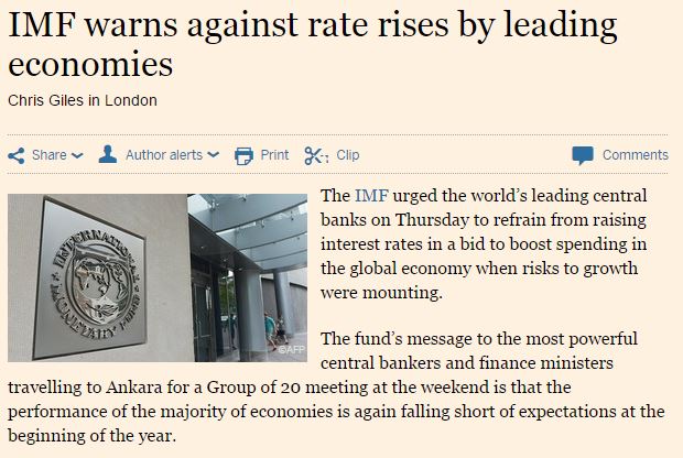 Το ΔΝΤ προβλέπει παράλληλα ότι «η οικονομική δραστηριότητα στις ανεπτυγμένες οικονομίες» θα «αναπτυχθεί με μέτριο ρυθμό φέτος και την επόμενη χρονιά», εν μέρει χάρη στην πτώση της τιμής του πετρελαίου στις διεθνείς αγορές. Αυτό δημιουργεί ανησυχία για την προοπτικη αύξησης των επιτοκίων από τις ΗΠΑ, καθώς θα τραβήξει το “μαξιλάρι” σε φάση νέων ρίσκων διεθνώς, σχολιάζουν οι Financial Times.