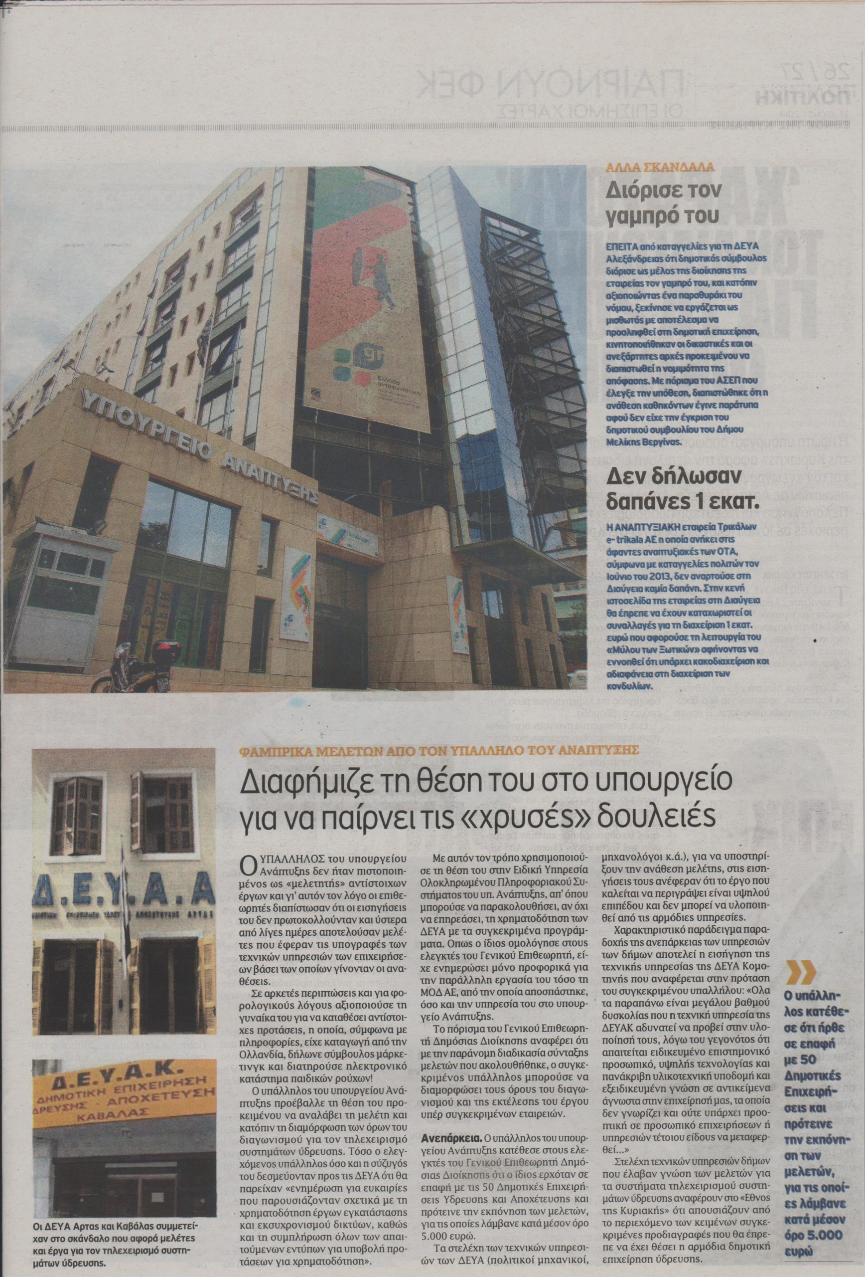 Το σκάνδαλο που αφορά τον τηλεχειρισμό συστημάτων ύδρευσης έχει πρωταγωνιστή υπάλληλο του υπουργείου Ανάπτυξης, 15 ΔΕΥΑ εκ των οποίων οι τέσσερις (Καβάλα, Άρτα, Χαλκίδα και Χανιά) δεν έχουν απογραφεί στη βάση δεδομένων του υπουργείου Διοικητικής Μεταρρύθμισης και ελέγχονται από τις εισαγγελικές και δικαστικές αρχές για τη νομιμότητα των αναθέσεων των μελετών, αλλά και των έργων που κοστίζουν εκατομμύρια ευρώ.