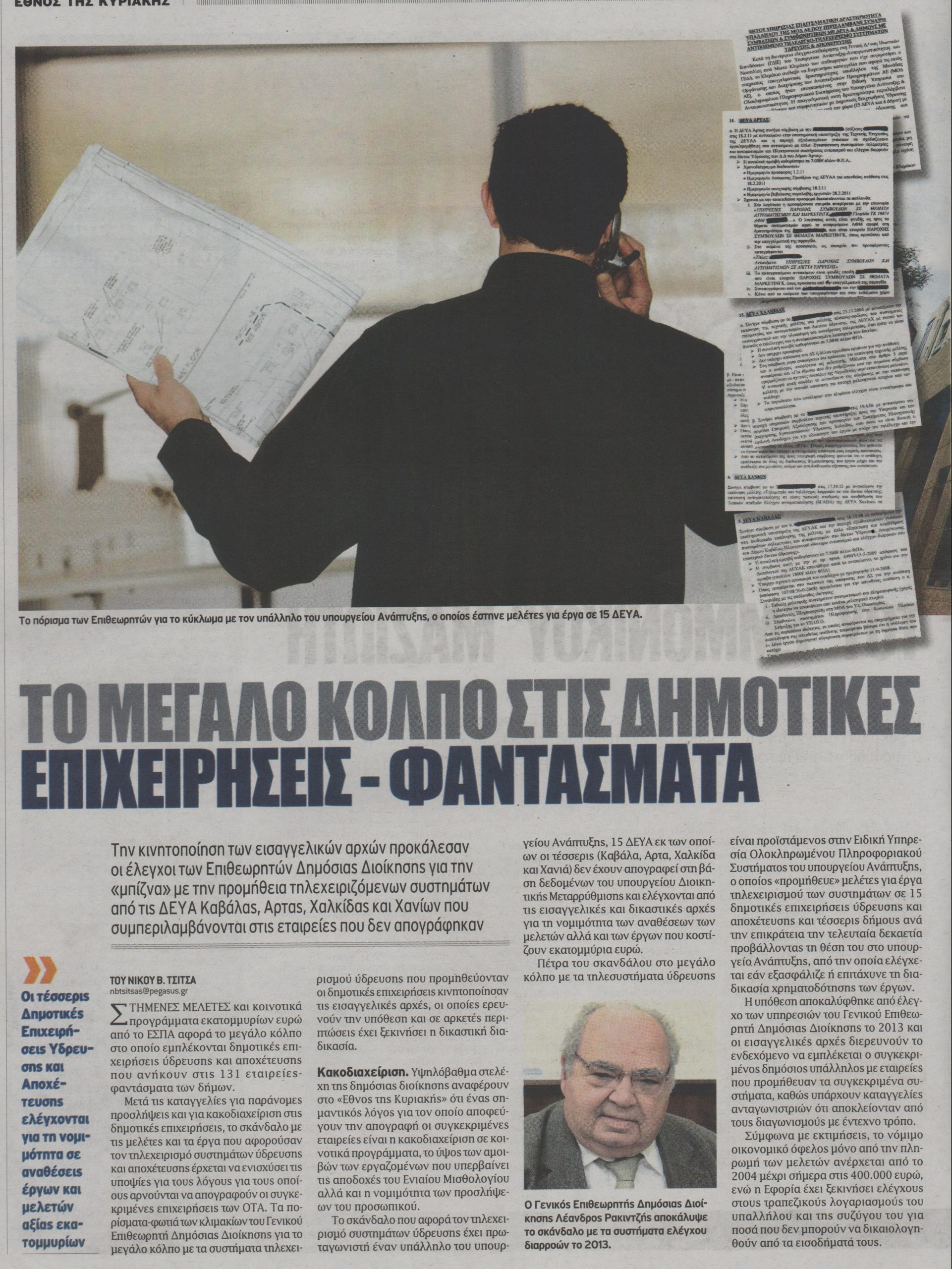 Στημένες μελέτες και κοινοτικά προγράμματα εκατομμυρίων ευρώ από το ΕΣΠΑ αφορά το μεγάλο κόλπο στο οποίο εμπλέκονται δημοτικές επιχειρήσεις ύδρευσης και αποχέτευσης που ανήκουν στις 131 εταιρείες “φαντάσματα” των δήμων.
