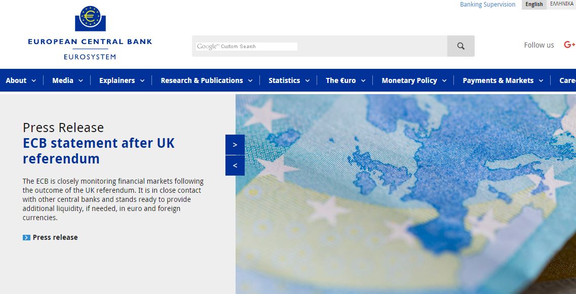 Μετά το αποτέλεσμα του βρετανικού δημοψηφίσματος, η Ευρωπαϊκή Κεντρική Τράπεζα παρακολουθεί στενά τις χρηματοπιστωτικές αγορές και βρίσκεται σε στενή επαφή με άλλες κεντρικές τράπεζας, αναφέρει η ΕΚΤ σε ανακοίνωση που ανάρτησε στην ιστοσελίδα της.